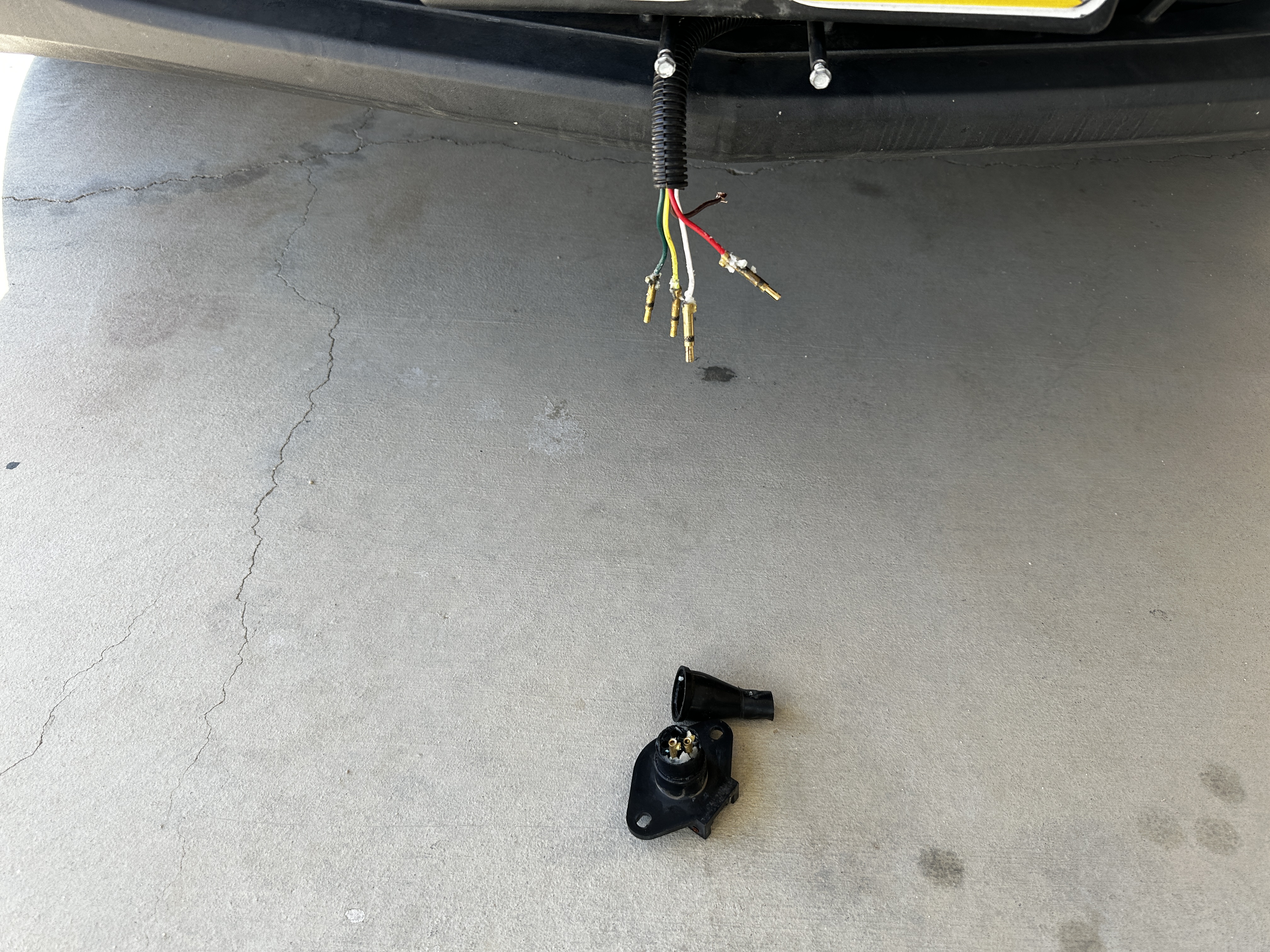 While hooking everything up prior to leaving the Bone Yard, I must have tried plugging the 5-pin end upside down. As a consequence, all of the pins inside were pushed through the back of the plug making it impossible for any of them to make contact. Therefore, there were no lights on the car while towing. So, we didn’t tow it.