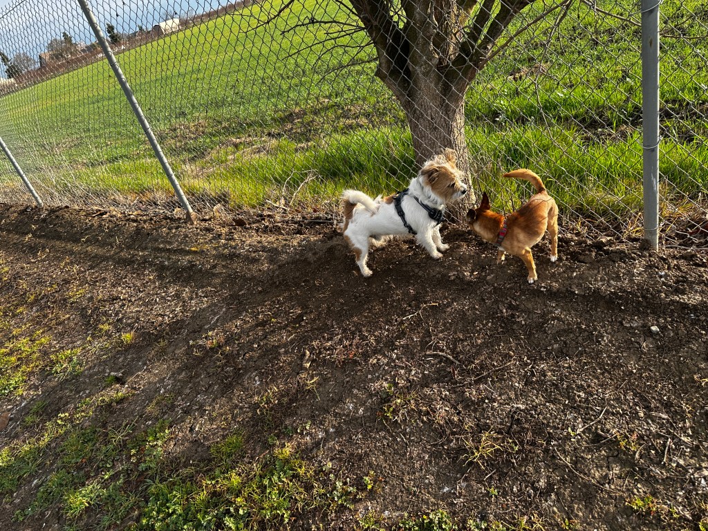While standing there, just looking around, a little brown chihuahua came running for Max from across the field.