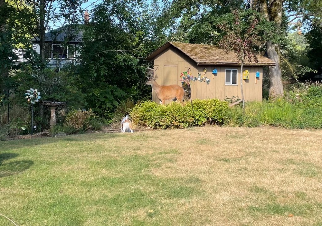 Max having a staredown with a buck in our back yard. The buck backed down after a long contest of wills.