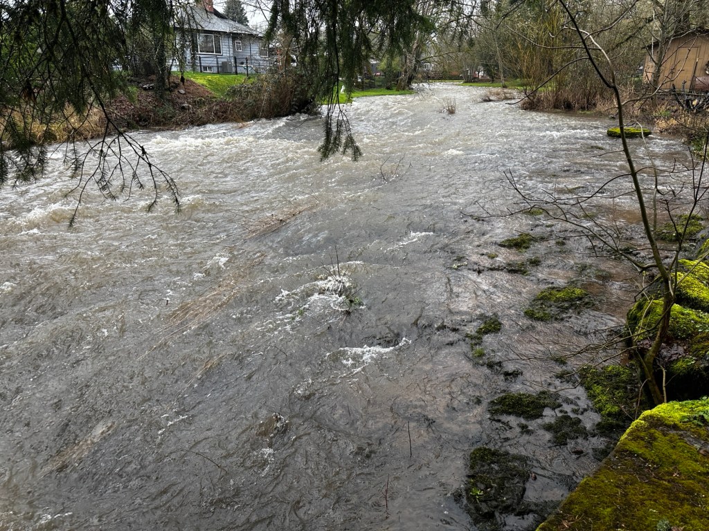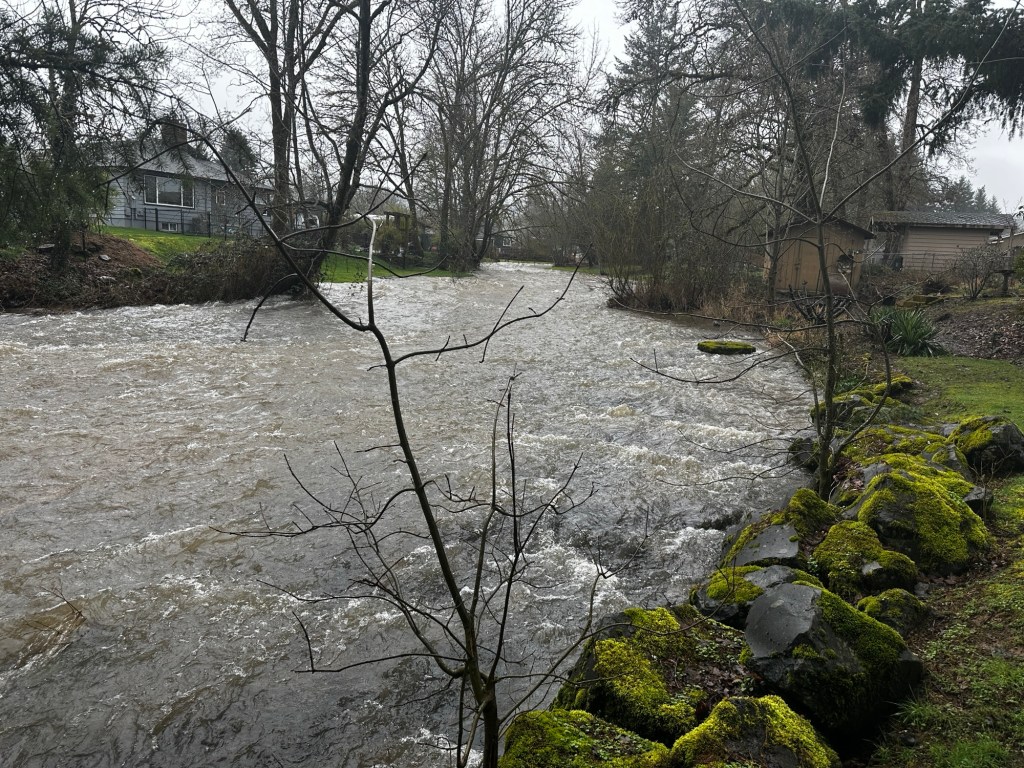 You can see that the creek is way up and running hard, sweeping over what is normally dry rock on our side.