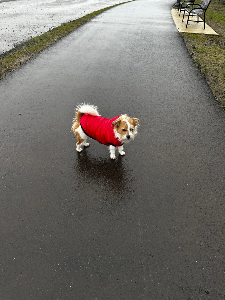 That’s Max in his red rain coat. He doesn’t like this one much because it has a hood. He’s not a fan of hoods, it seems. So, I button it back so it leaves his head free. I took this on one of our walks down by the river. He likes it down there because I take his leash off and let him run free as often as I can. He’s interesting in that when he;s on his leash he gets very aggressive with mig dogs, but running free he’s everyone’s friend.