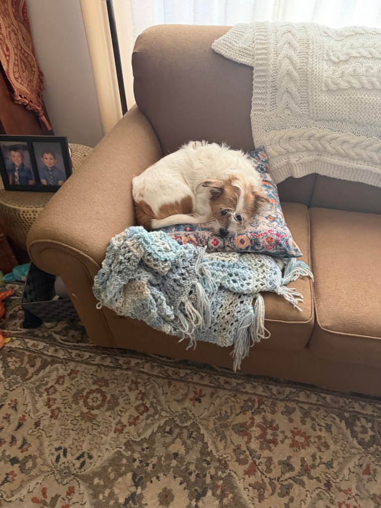 Max is making his presence known by slowly walking past me to go stare out the patio door, longingly, at the back yard. When I don’t react, he turns around and hangs his head as he walks back to his perch on a couch.