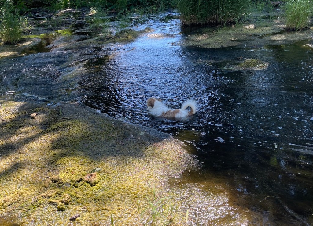 Once we get back to our house I let him off the leash and he leisurely strolls to the creek and wades in until the water is halfway up his side, then lays down to cool off. It’s been very warm lately so can’t blame him. The excessive heat is helping algae/moss grow like gang busters. After his cool-off period, he wades out to the long strings of moss, sticks his head in the water to get a mouthful then he pulls it up and shakes it like he’s trying to get rid of it. Very strange. Sadly, all this wading in the creek and trying to kill the moss causes him to smell like an Everglades swamp monster of some sort. He doesn’t mind, but Diane gets a bit testy when he jumps in her lap to share.
