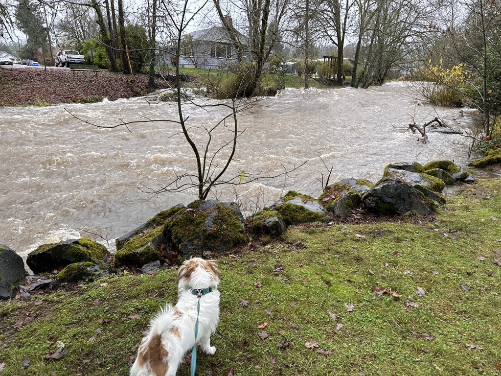 It’ll go back to normal eventually. Thankfully, he hasn’t fallen in while it’s running this high and fast. He’s not afraid of it but he respects the potential disastrous results should he venture in for a swim. I’ve had talks with him about that and I think he gets it. If he falls in my only recourse would be to make a beeline to the point where Milton Creek joins the Columbia River. That’s only a couple of miles away. If I miss him there then he’s getting a trip all the way to Astoria, another 60 miles. I’m pretty sure he doesn’t want to be dog-paddling that far. So, he keeps his distance.