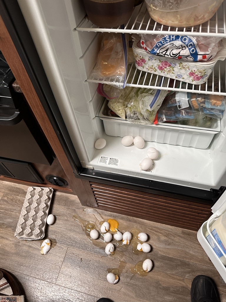 So, after getting home from our last getaway, I got a little eager about getting things put away and violated a prime directive about opening the refrigerator too quickly.