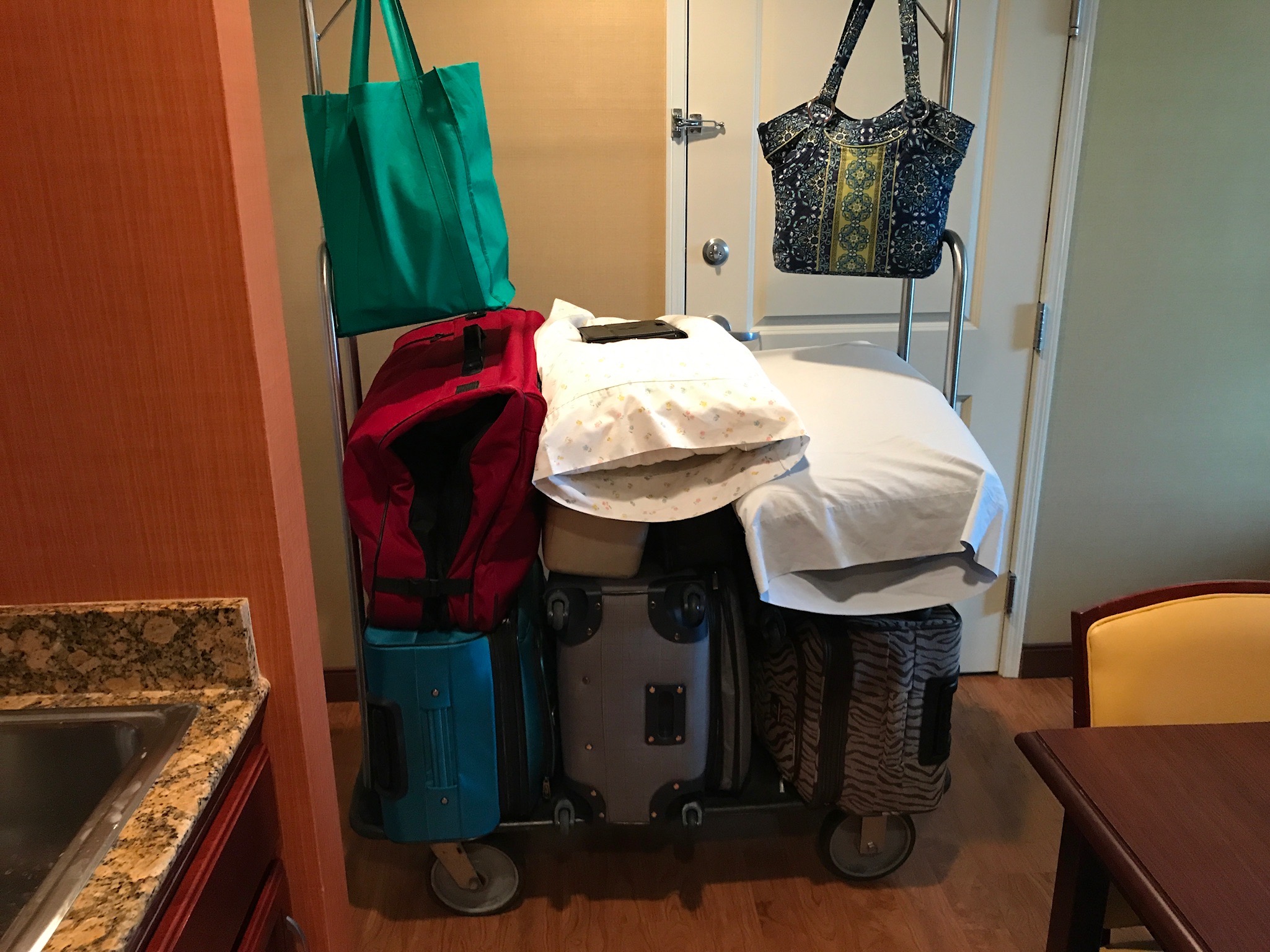 Thankfully, having two healthy teenage girls along simplifies the on and off load process. They can carry some pretty heavy stuff. That’s really handy. Before leaving, Diane requested that I devise a way for “stuff” to keep from sliding around in the back so I did. I went to Wal-Mart and bought a bunch of Sterilite (made in the USA) containers the pretty much filled the back of the truck. I got them all in place, so they wouldn’t slide around, then removed those that were in spaces required for suitcases. In all, we have 7 pieces of luggage, six of which reside in the back of the truck. There are also 8 Sterilite containers. Nothing slides around. Using the containers makes getting “stuff” inside our rooms easier than when we used garbage bags. It’s less embarrassing for Diane, too.