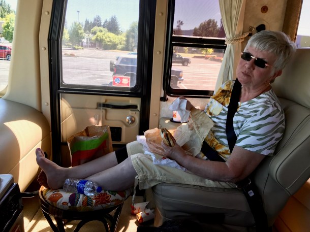The first leg of this trip ended in Medford for our first night. When we head south, Medford is almost always our choice for the first stop. Before that, however, we stopped in Albany for lunch with Jack and Wynette. They were making their way north from Arizona and we were very happy to have an opportunity to spend some time with them. Lunch was good and we had a great visit. Then we parted and continued on our separate ways with well wishes for safe journeys.