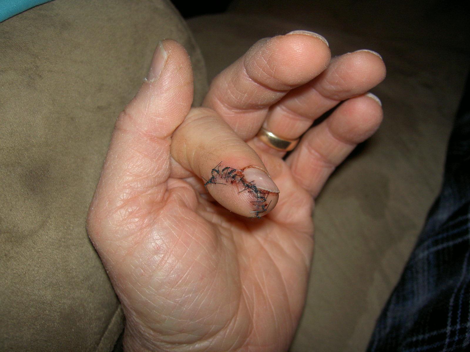 This isn’t for the squeemish. The following is a detailed account of how I happened to be blessed with the 12 stitches depicted above. I believe I reported this incident in a previous (old) blog entry so if you read that one and find discrepancies, the old one was incorrect.