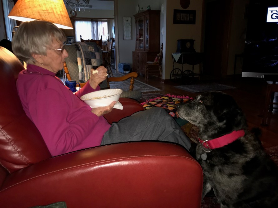 Lunch was delayed for a bit while we cleaned up the remnants of the microwave turntable which Diane took out and threw on the floor in a frenzy. That’s not true, of course. It was a total accident. She was removing the syrup she heated up for the waffles the the wire rack for use during the convection cooking periods caught on the turntable. On its way to the floor, the turntable hit the handle of the skillet I used to cook her eggs and the eggs were still in it. The skillet flipped up in the air, separated from the eggs and everything landed on the rug, side by side, just after the turn table landed and broke to smithereens. Diane immediately said “I can still eat the eggs” but I wouldn’t let her. She barely argued when I took them away from her. I was pretty sure she was kidding, but didn’t want to take a chance.