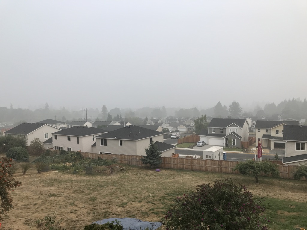 At this time, we’re currently on the second day of a trip to Bullard’s Beach State Park in southern Oregon. It’s a great way to sequester. One big reason to head west was to get away from the forest fire smoke we’d be breathing for a week or so. This is what it looked like off our back porch: