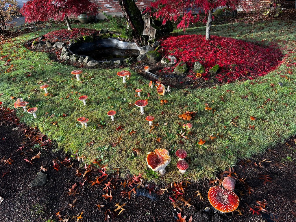When Max and I walk around the block we pass by a yard with interesting toadstools. They began as orange balls emerging from the grass then changed to these.
