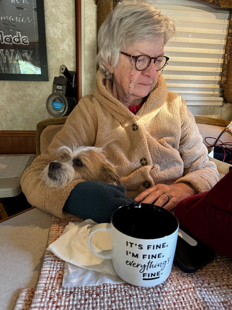 Diane’s wearing his favorite coat because she’s cold, too. It was 29 when I got up this morning. That was outside. Inside it was a numbing 39. You’d think that smart people would leave a heater running through the night, right. Well, I’ve read too many stories about those things catching on fire. As for the propane furnace, they kill people in the night, too. So, we just let thing go natural and deal with it. Besides, once everyone is up the furnace warms it up quickly. That’s true unless you’re me, and you get up 3 hours before Diane, and you really do not want to turn the furnace on until she gets up. That’s not because I’m afraid, honest. It’s because it’s the kind thing to do. The furnace is noisy.