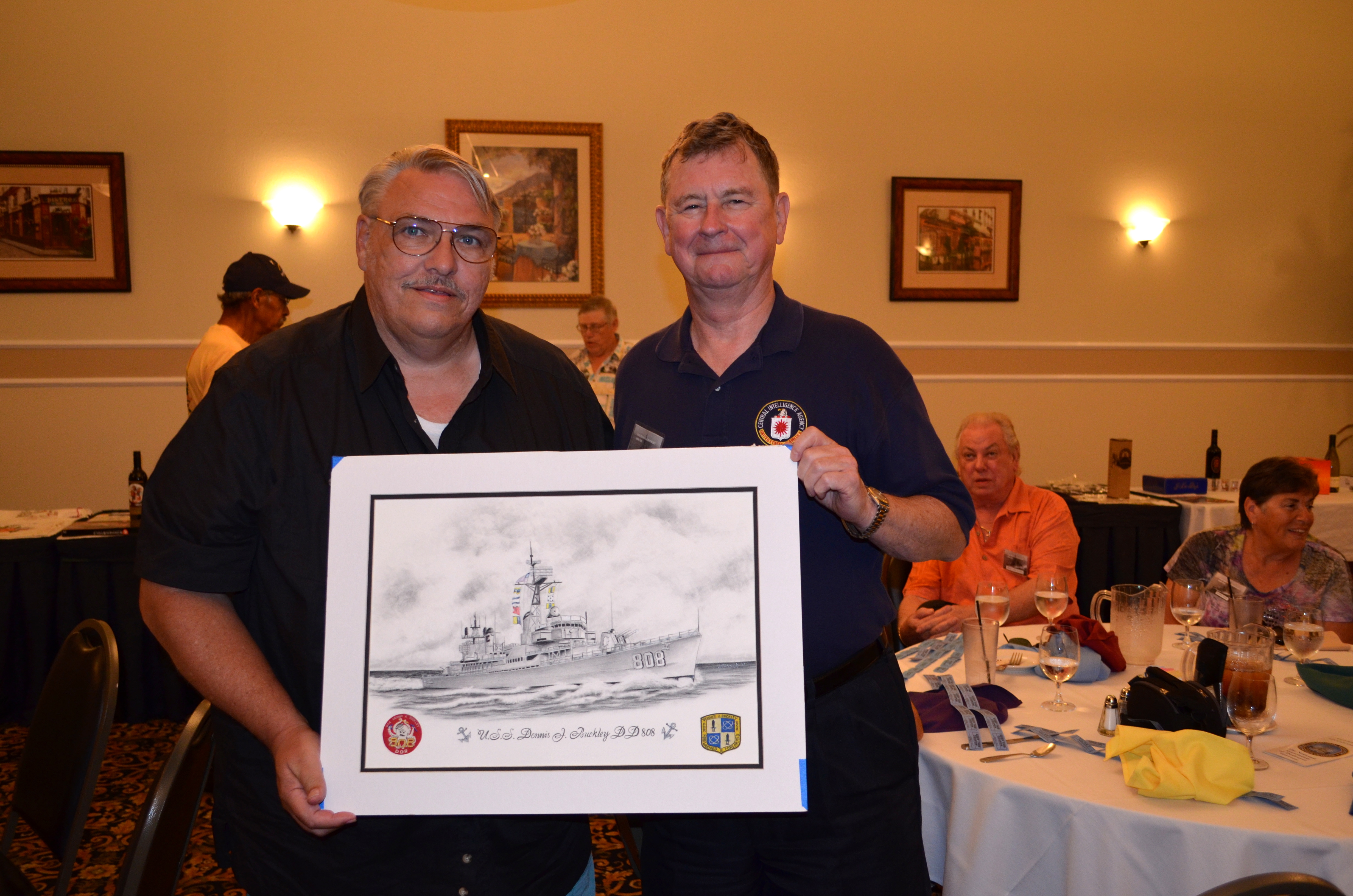 Once the bidding was done, and the raffle was over, all of the crewmen signed the back of the drawing indicating their years of service on that ship. The winning bidder is a retired Navy Captain who plans to give it to the wife of one of the friends he made while serving aboard the Buckley in the early 60’s. This friend went on from the Buckley and eventually went on to receive his own command at sea. During his tour as the CO, he fell down a ladder and broke his neck, rendering him immobile. Everyone knew the CO, from his fledgling years as a junior officer so this tribute to him is a pretty awesome thing.