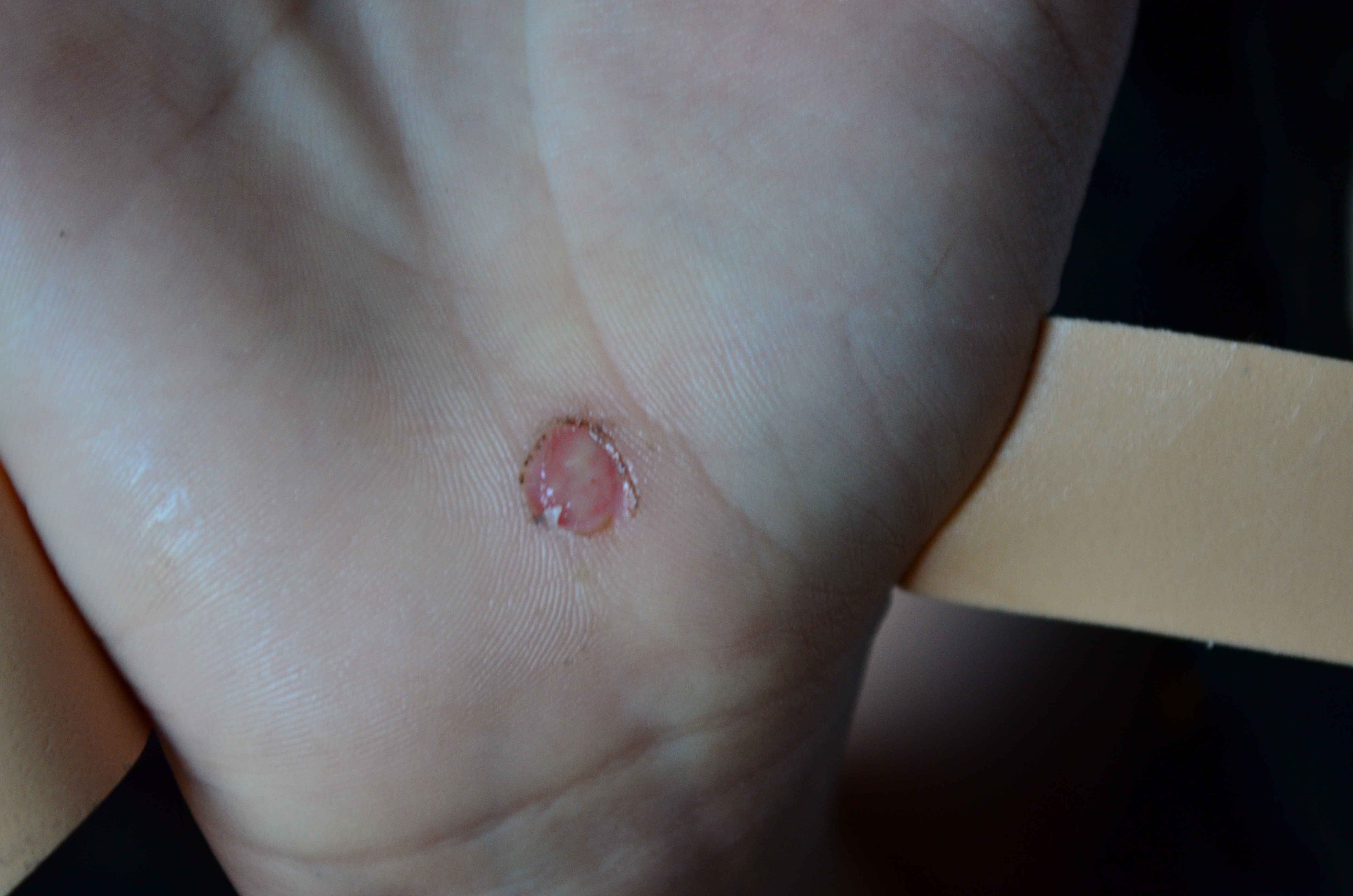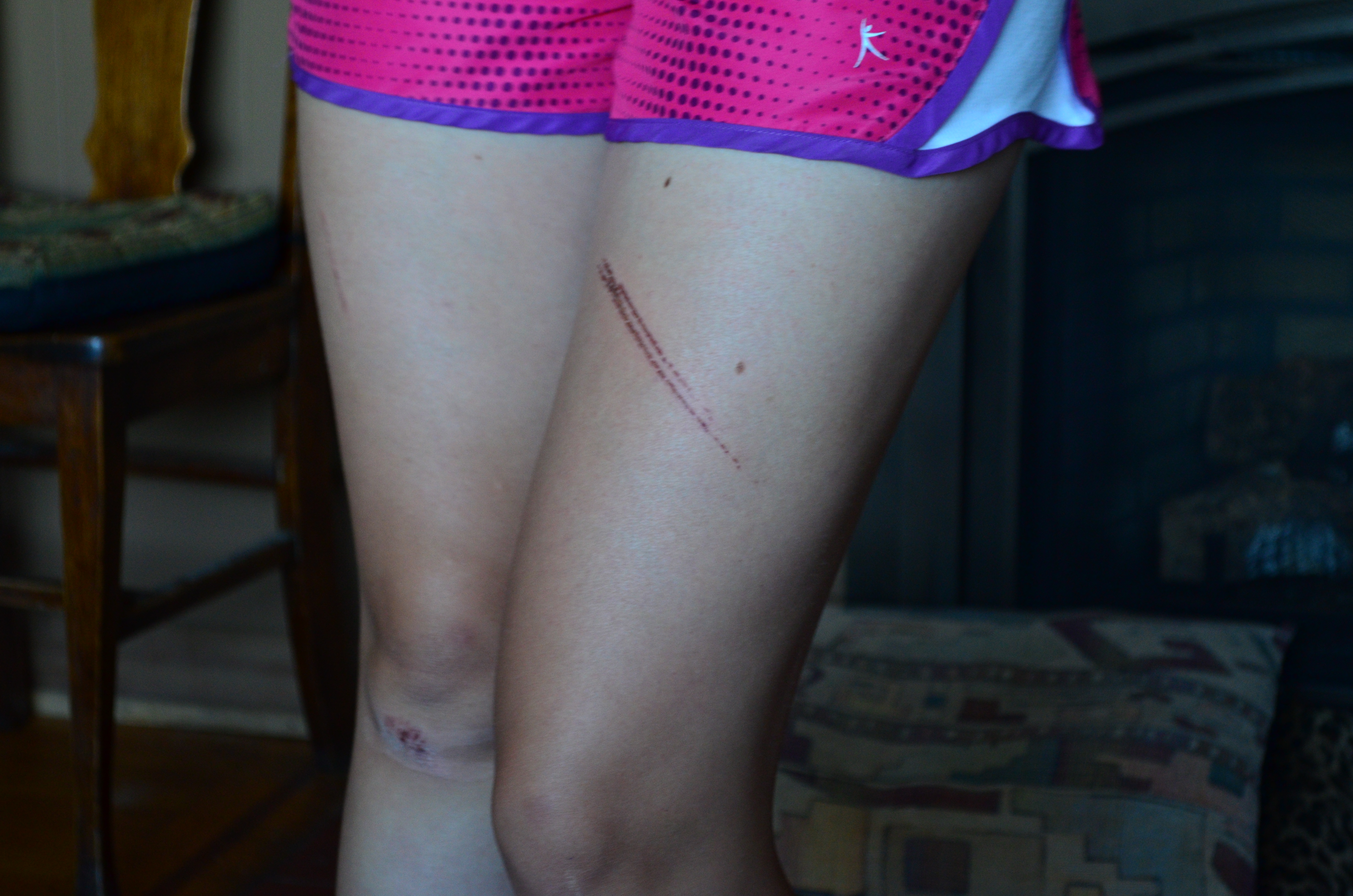 Over the past couple of days we had visits from Jennie with Lydia, and Jeran in tow. They spent last weekend camping at Big Eddy, and, knowing my prolific ability to injure myself, stopped by to show me theirs. Both of them hurt themselves running around the camp ground, in the dark, finally falling victim to some hard to see ropes holding down a neighbor’s tent. I would never do something like that. Mainly because it involves running. Here’s what they did to themselves.