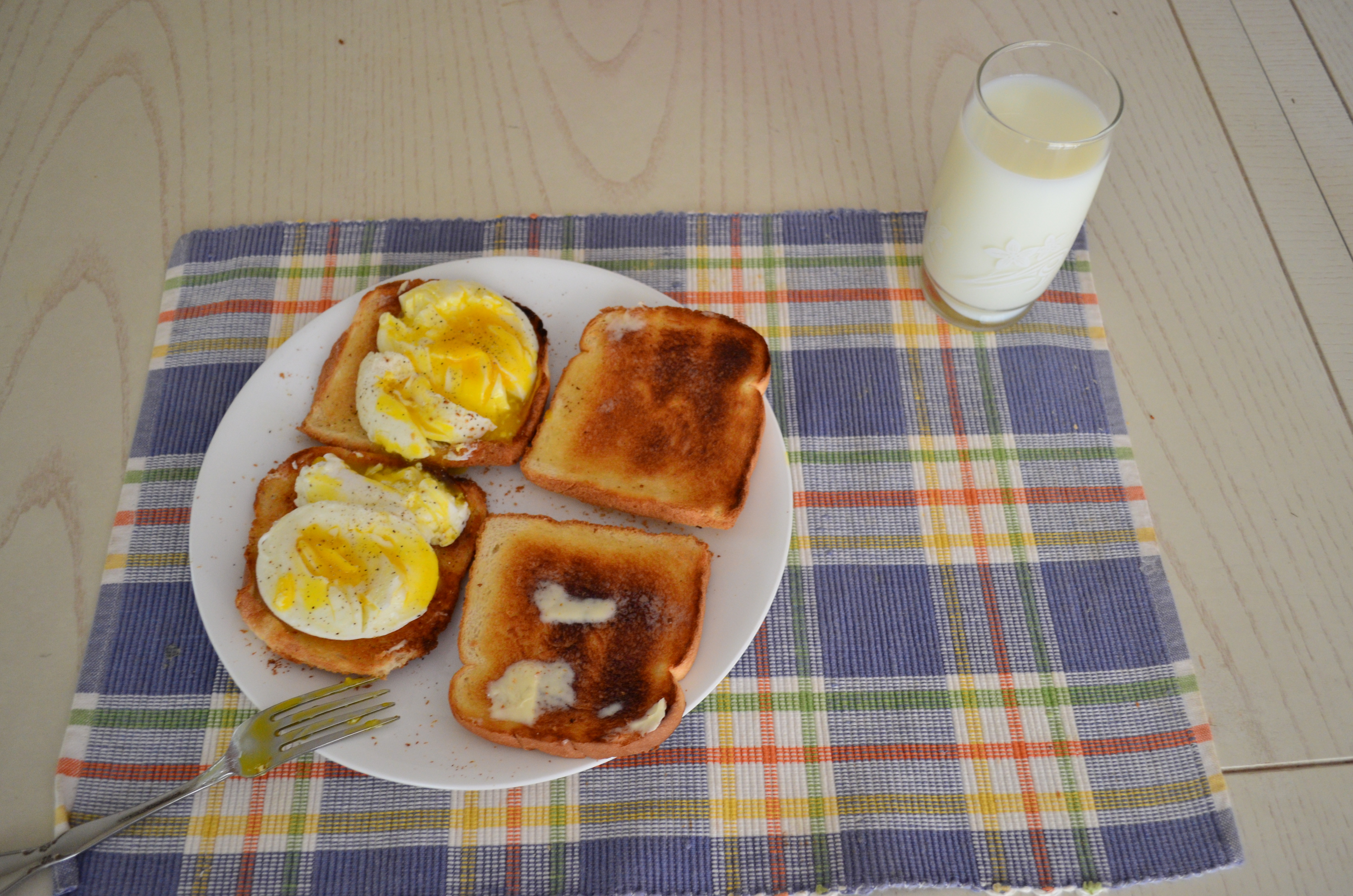 Now, supper is done, I’m clean, and it’s time to just relax while watching some guys beat the crap out of each other with MMA. But first, I’ll just give you a visual on my lunch. It’s a three poached eggs and four pieces of toast. I made two sandwiches. Nice.