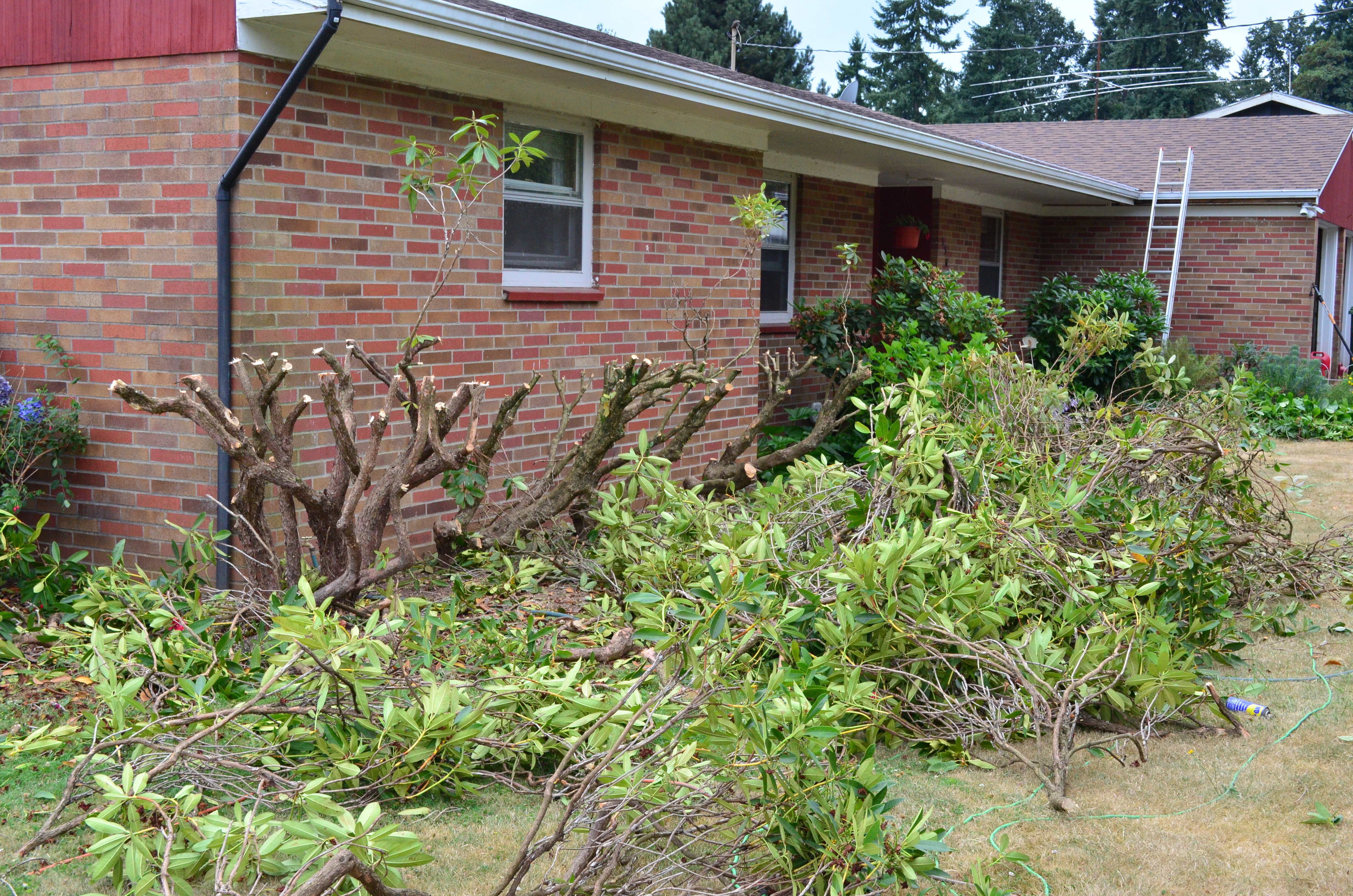 The rest of the day was a blur of activity accompanied with a prodigious amount of sweating on my part. Remember that rhododendron hedge I trimmed yesterday? This one?