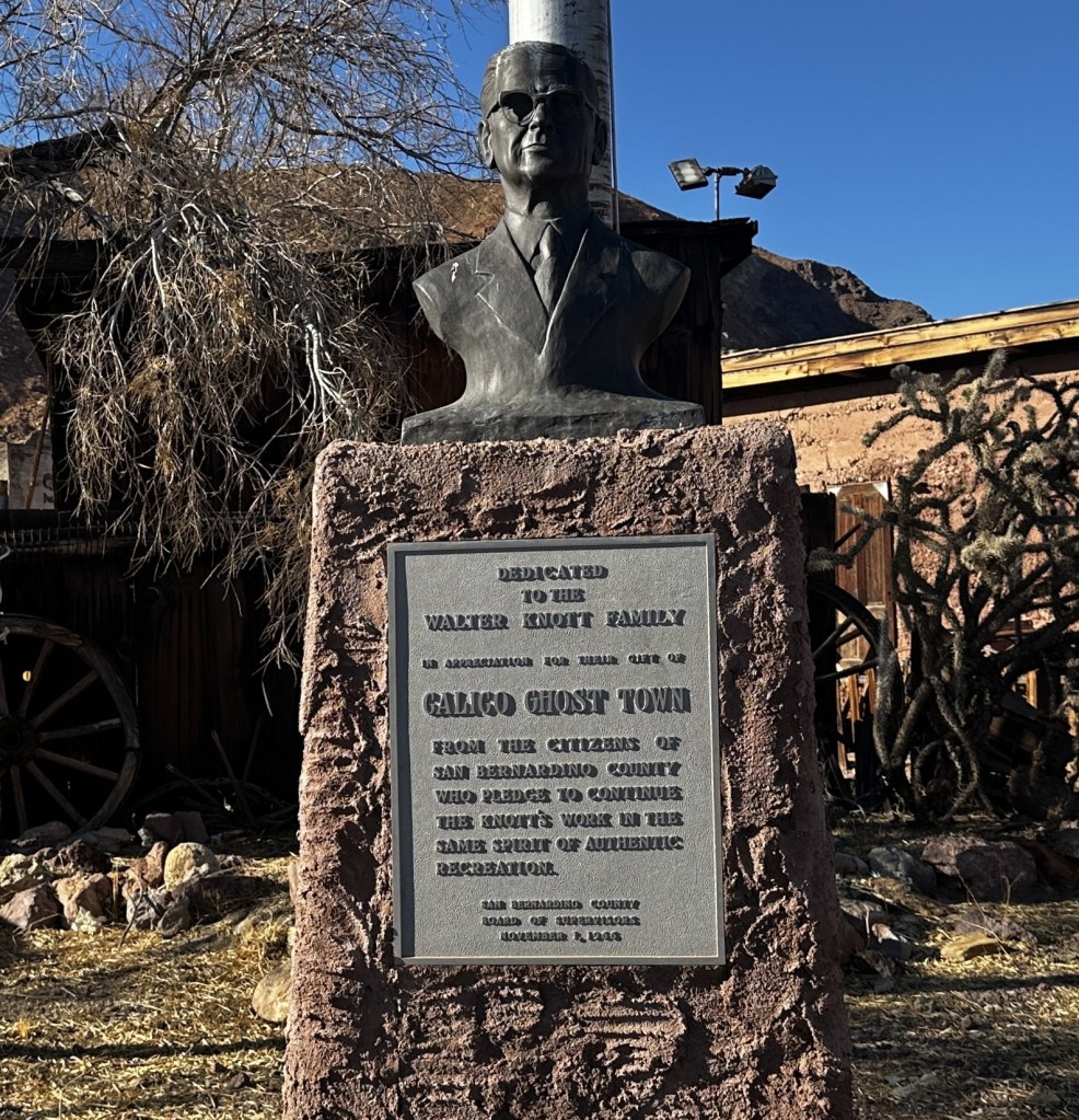 Just before lunch we loaded ourselves into the car and drove to Calico Ghost Town Regional Park so have a look around. It’s an interesting town that Walter Knott, Knott’s Berry Farm, purchased in the 1950’s and resurrected it. I know this is true because I saw a plaque up there, and I took a photo of it.