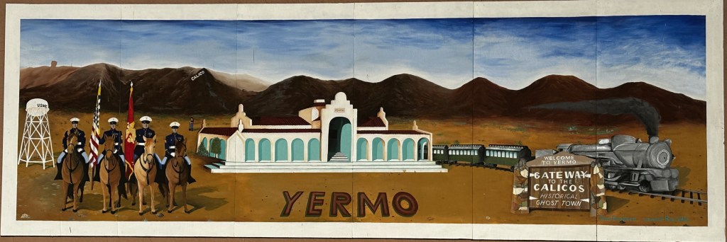 An interesting thing about Yermo is that the base we’re on, Marine Corps Logistics Base Barstow, stretches to the east far enough that Yermo claims part of it as their own. Specifically, they claim to be home for the Marine Corps Mounted Color Guard. Here’s proof in a Yermo mural.